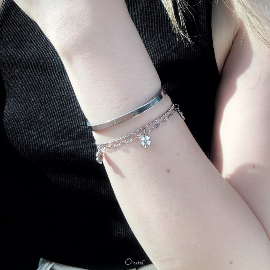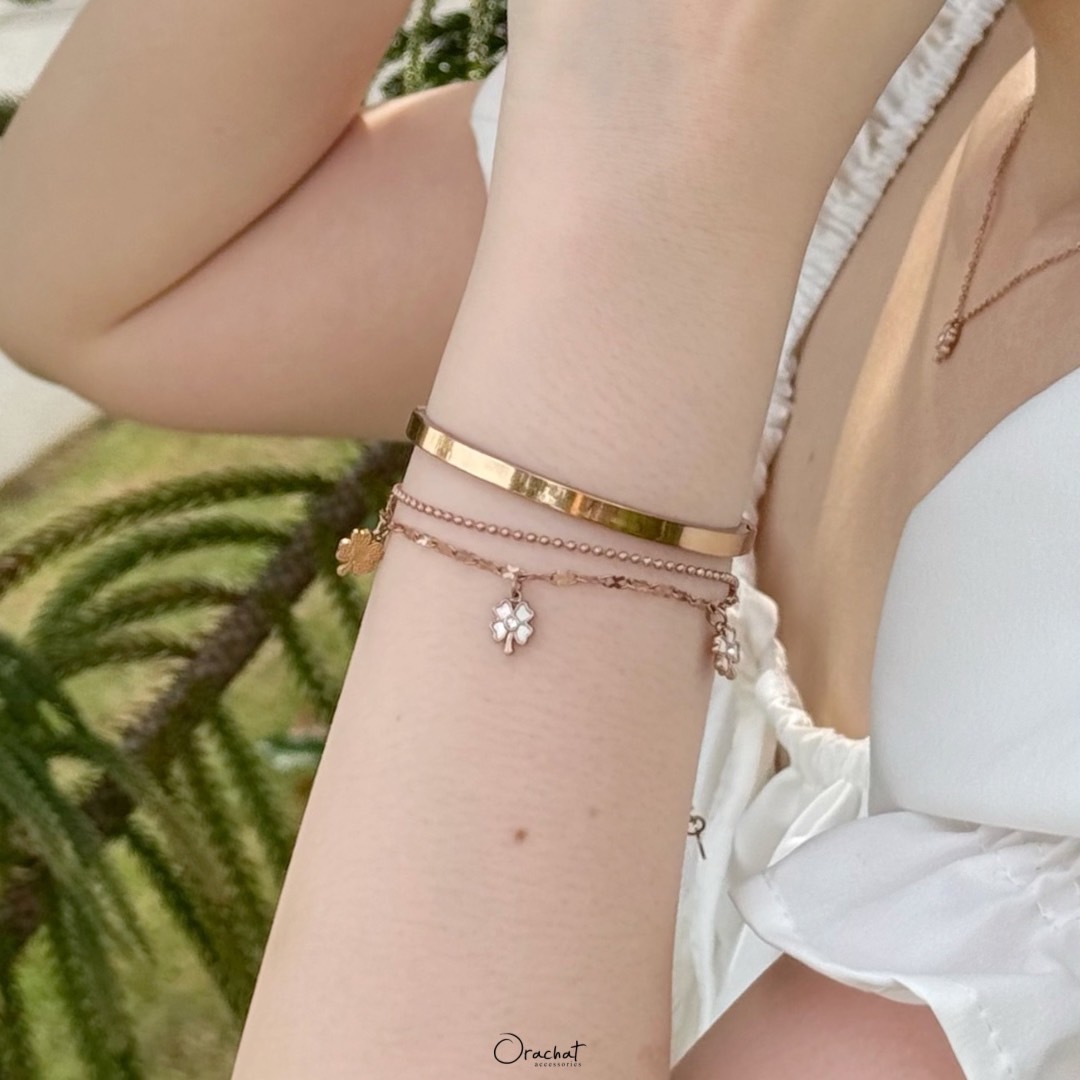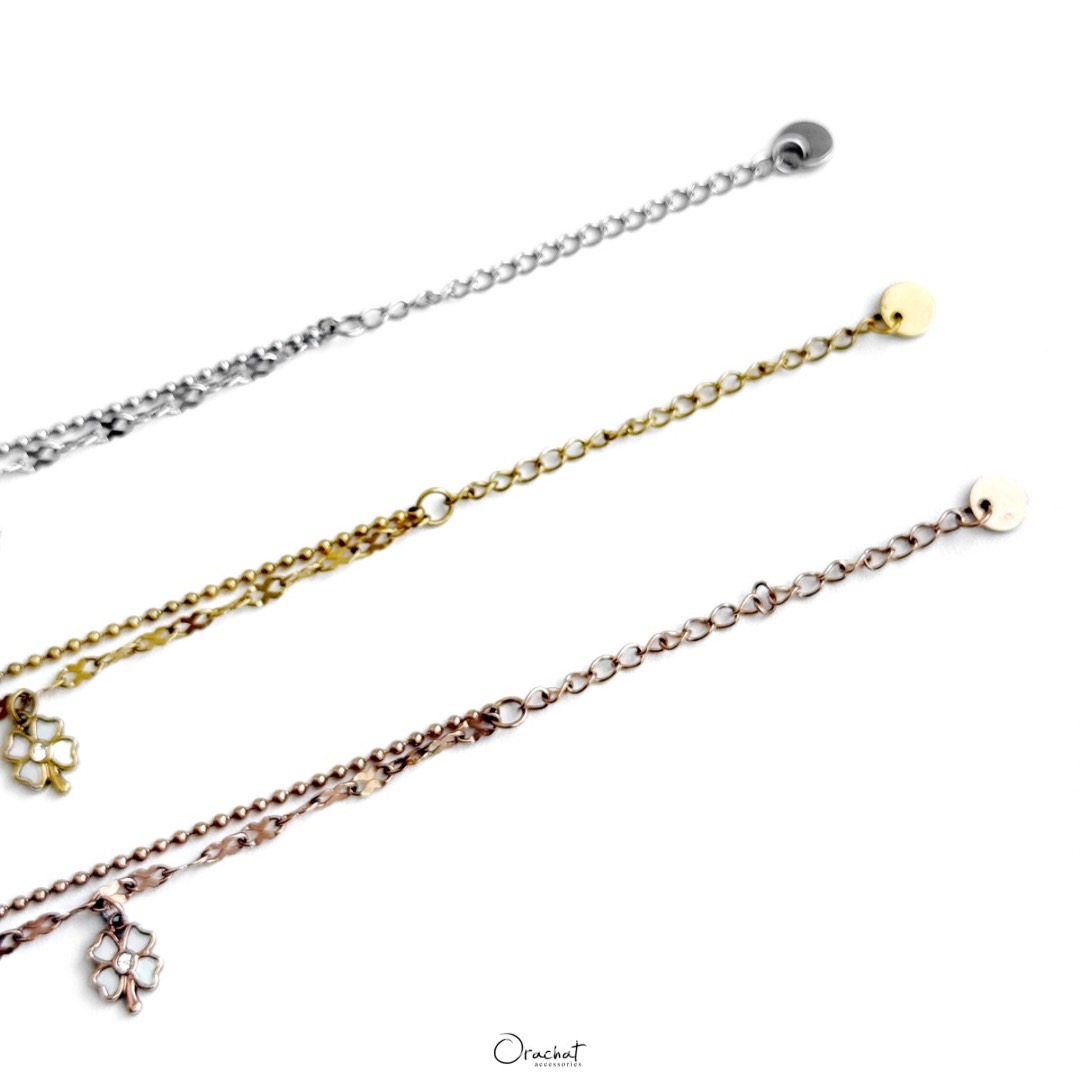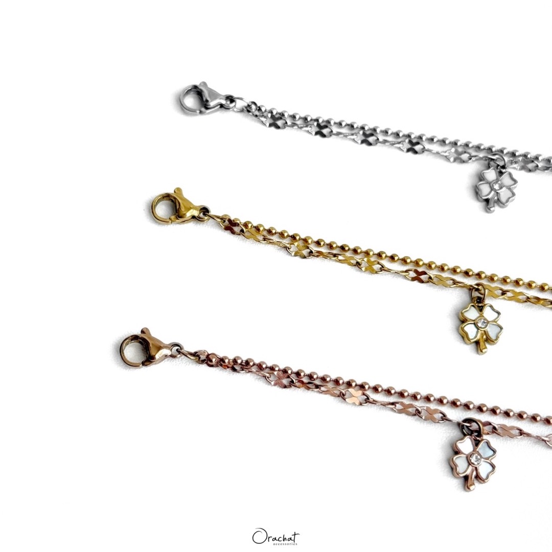 Fortune Clover 14k bracelet. คุ้มค่า น่ารัก และความหมายดี ใส่เองก็น่ารัก ซื้อเป็นของขวัญคนรับก็ประทับใจ รุ่นนี้ตัวสร้อยเป็นแบบ 2 เส้นติดกัน ห้อยด้วยจี้ใบโควเวอร์จิ๋วตุ้งติ้ง ตกแต่งด้วยเปลือกหอยมุก เรียบหรู โซคิ้วท์สุดๆ ใส่ง่าย ใส่ได้ทุกโอกาส 🍀 มีความเชื่อกันว่าใบโควเวอร์ 4 แฉก คือสัญลักษณ์แห่งความโชคดี ใครพกติดตัวไว้จะพบเจอแต่ 💪🏻 ตัวเรือนสแตนเลสสี 14k ไม่ลอกไม่ดำ สวย ทน เงา โดนน้ำ โดนน้ำหอม ใส่ล้างจาน ใช้เจลแอลกอฮอลล์ได้สบายๆเลยค่ะ Size : - ยาว 21 cm | ปรับได้สั้นสุด 16 cm - จี้ขนาด 7x9 mm Color : Silver, Gold, Rose Gold Price : ฿690.00 —————————————————————