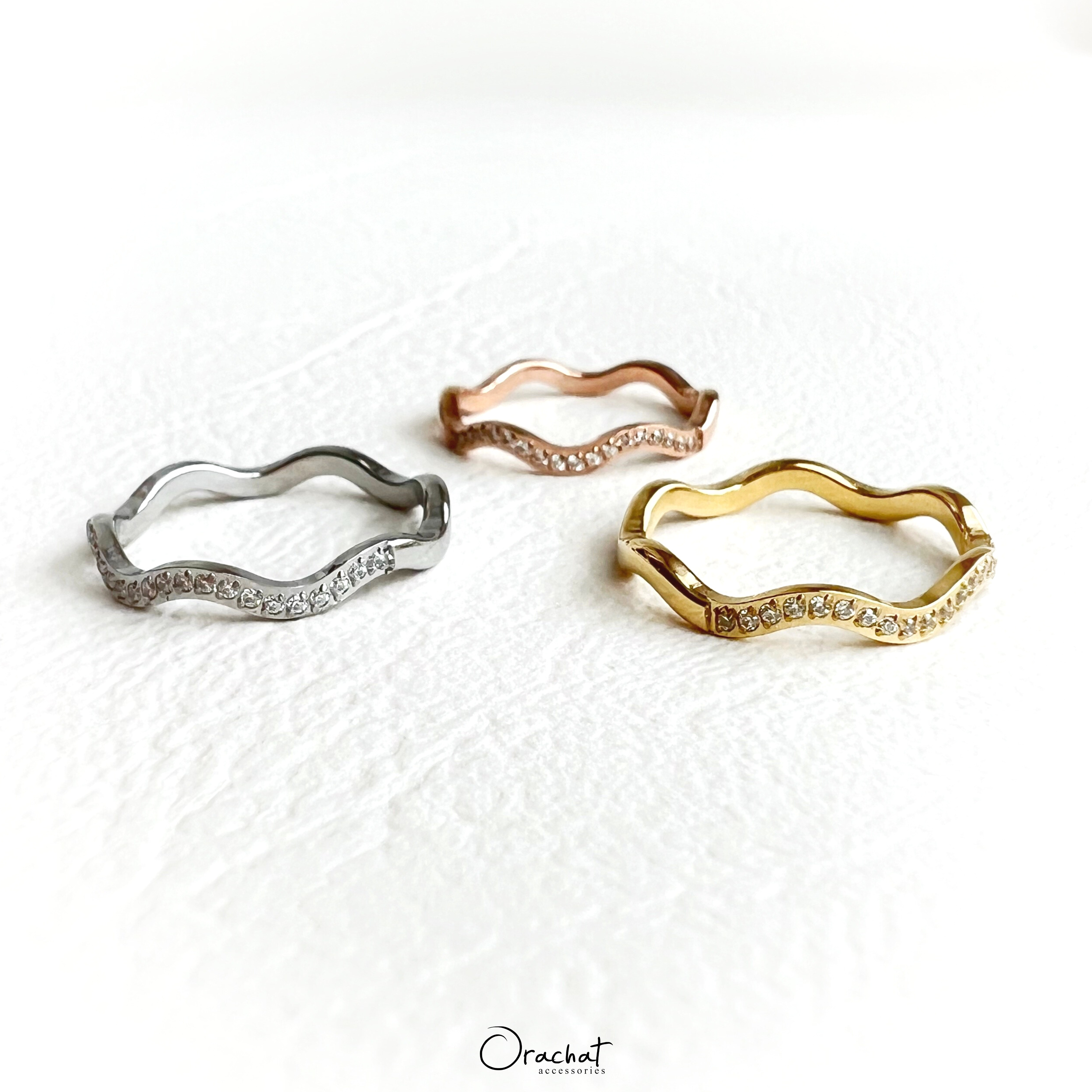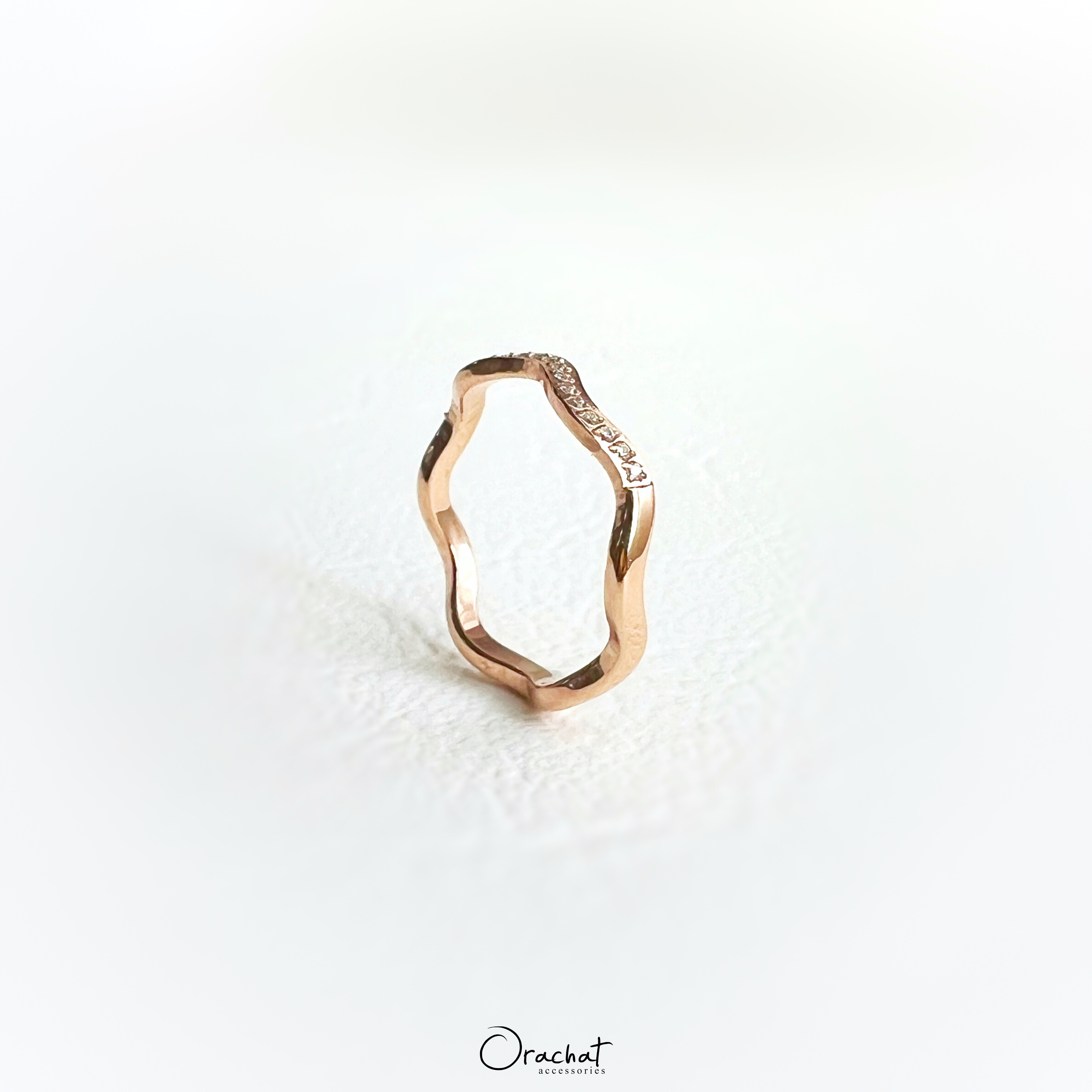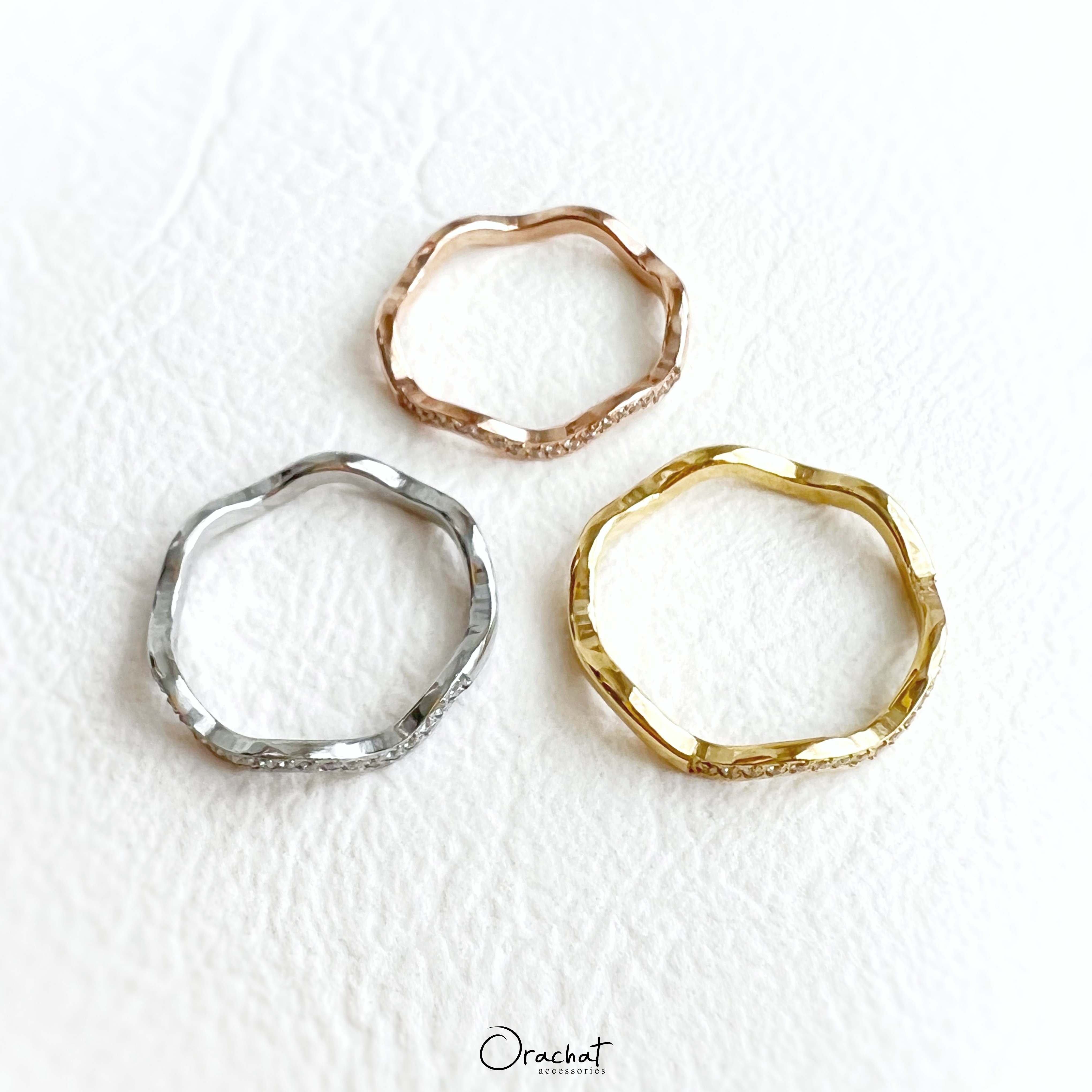 แหวนเกลี้ยงลายคลื่นสุดคิ้วท์ แต่งด้วยเพชร CZ ครึ่งวง งานสไตล์มินิมอลใส่น่ารักๆใส่ได้ทุกวัน แอบบอกว่ารุ่นนี้ใส่ซ้อนกัน 3 วงสวยมากกก เรียบหรูดูแพง ฟีล 3 กษัตริย์