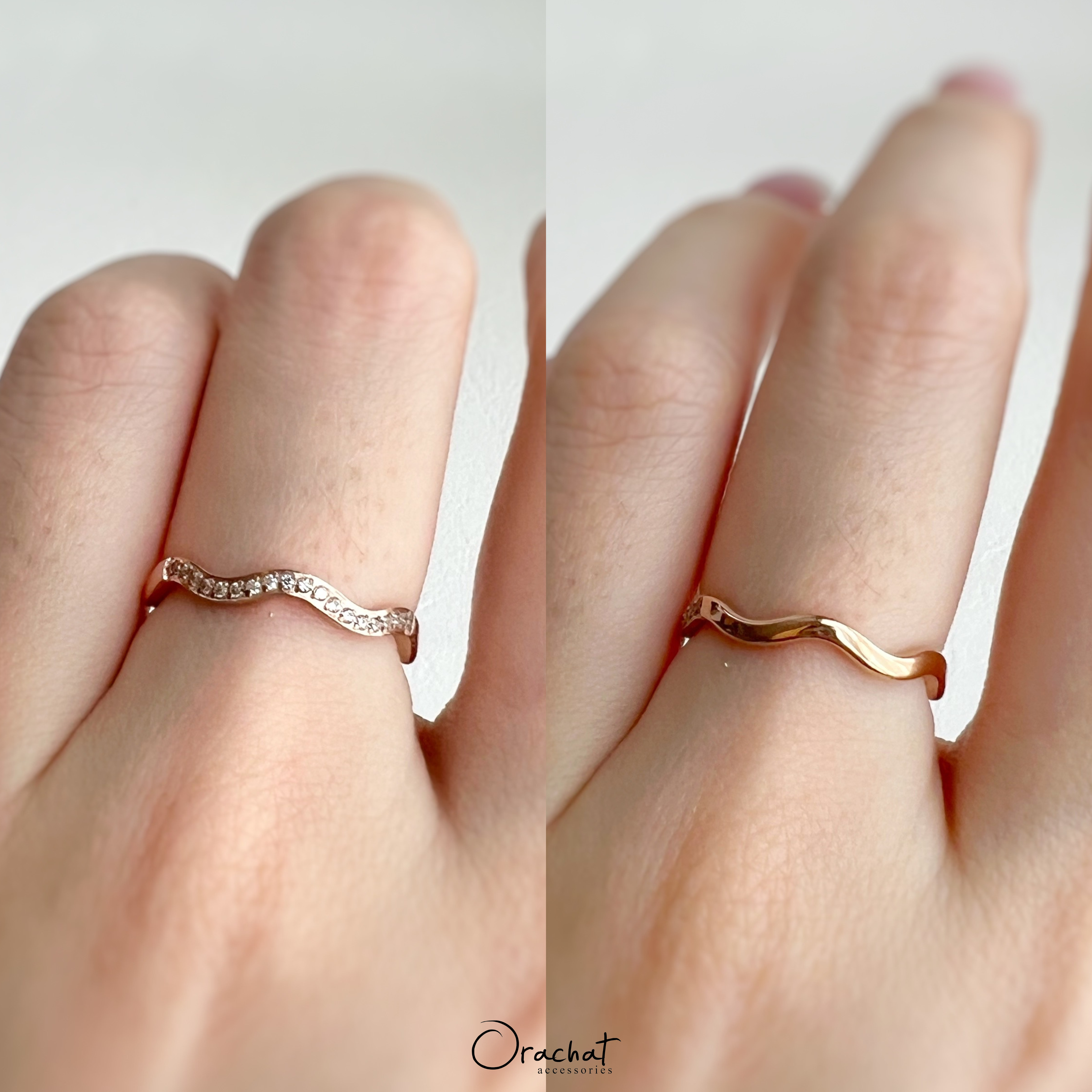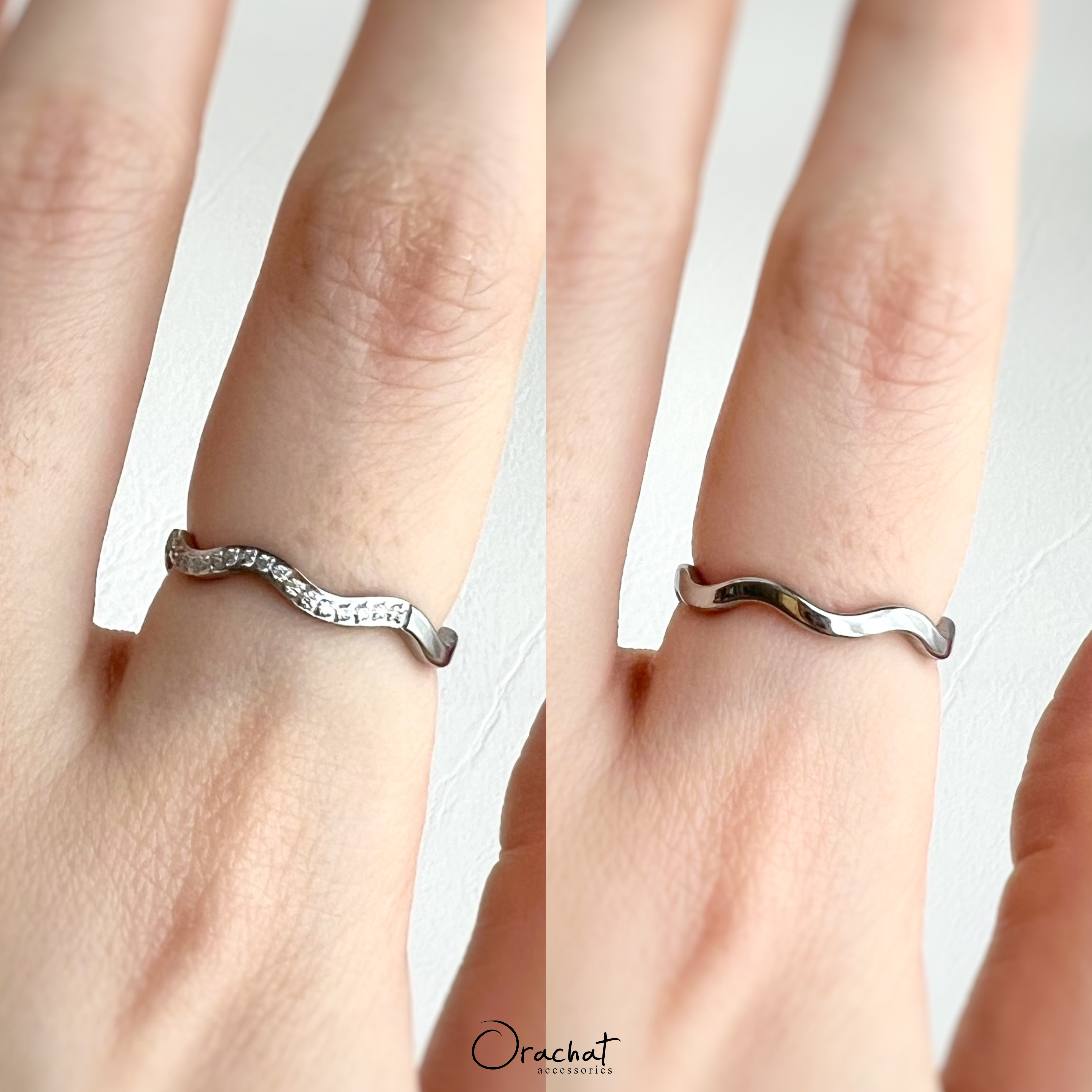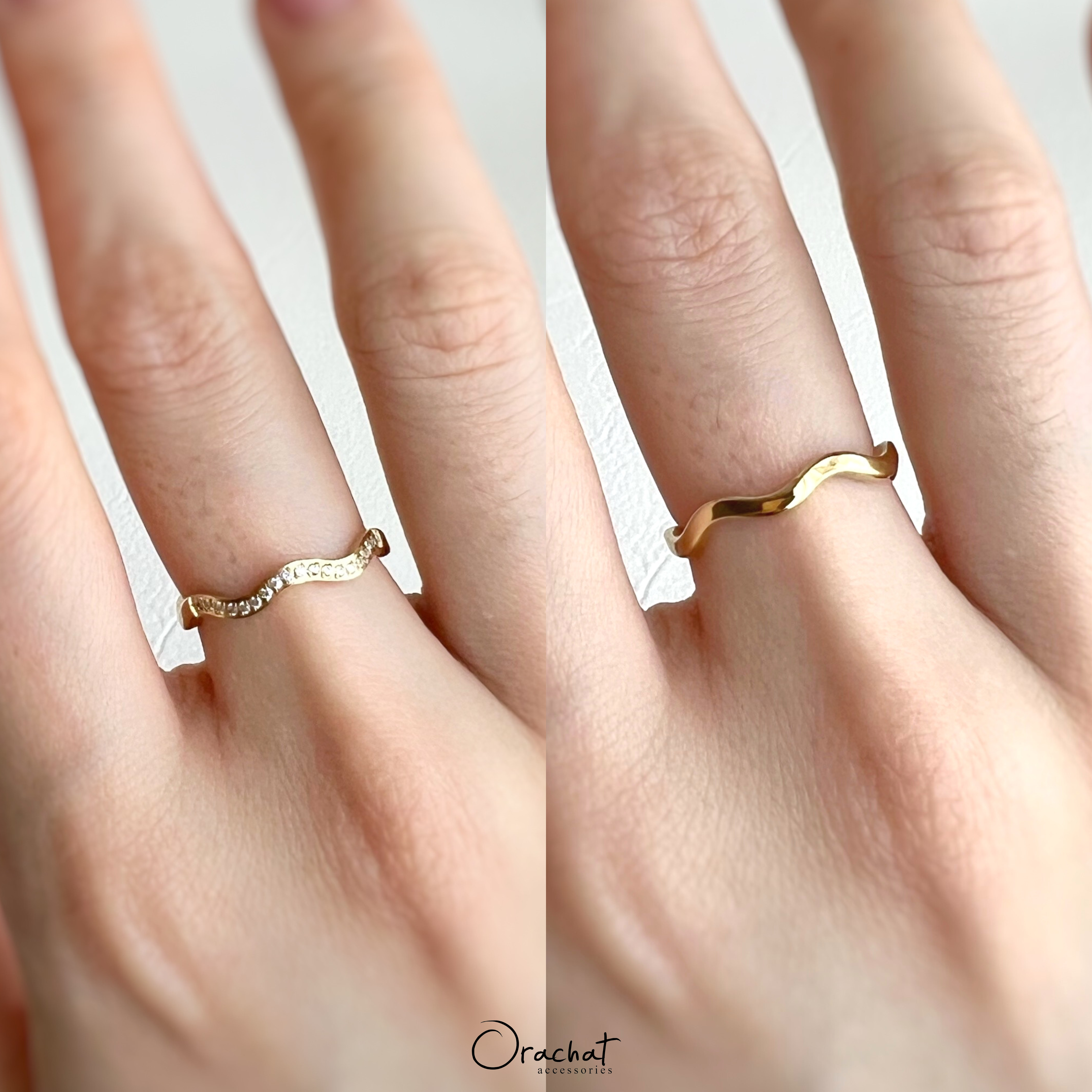 แหวนเกลี้ยงลายคลื่นสุดคิ้วท์ แต่งด้วยเพชร CZ ครึ่งวง งานสไตล์มินิมอลใส่น่ารักๆใส่ได้ทุกวัน แอบบอกว่ารุ่นนี้ใส่ซ้อนกัน 3 วงสวยมากกก เรียบหรูดูแพง ฟีล 3 กษัตริย์