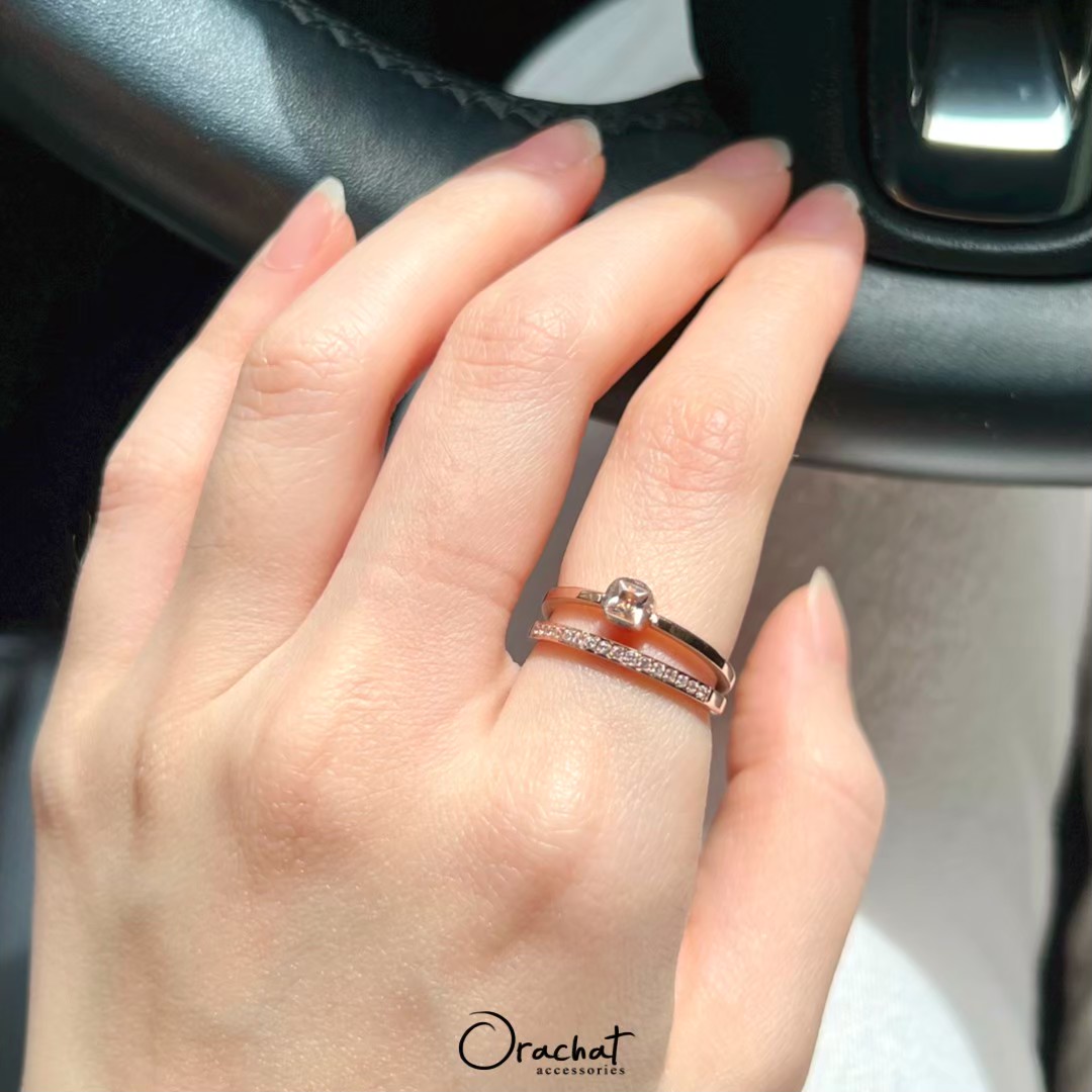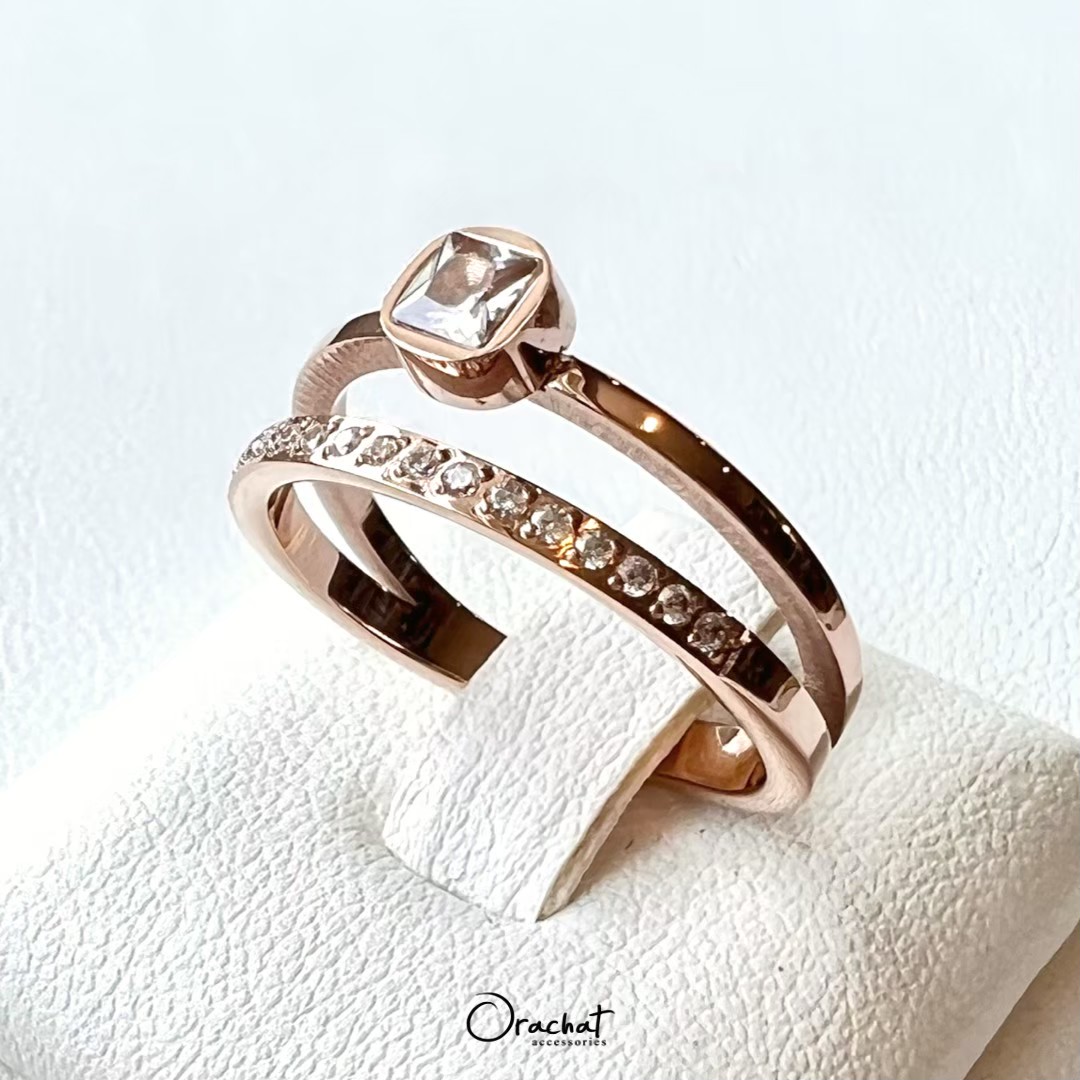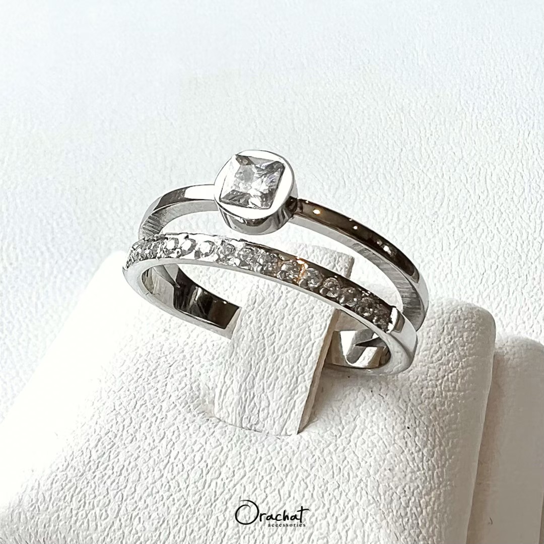 แหวน 2 ชั้น ดีไซน์สุดคลาสสิค สวยเก๋ ดูดี มีรสนิยม คุ้มมาก ซื้อ 1 เหมือนได้ 2 วง! ชั้นนึงเป็นหัวเพชรเรียบ อีกชั้นเป็นเพชรแถวครึ่งวง ใช้เพชร CZ เกรดพรีเมียม สวยวิ้งเล่นไฟมากกกกก งาน jewelry ขึ้นห้างขายหลักพัน ตัวเรือนชุบ 14k (สแตนเลส) ไม่ลอกไม่ดำ สวย ทน เงา โดนน้ำ โดนน้ำหอม ใส่ล้างจาน ใช้เจลแอลกอฮอลล์ได้สบายๆเลยค่ะ