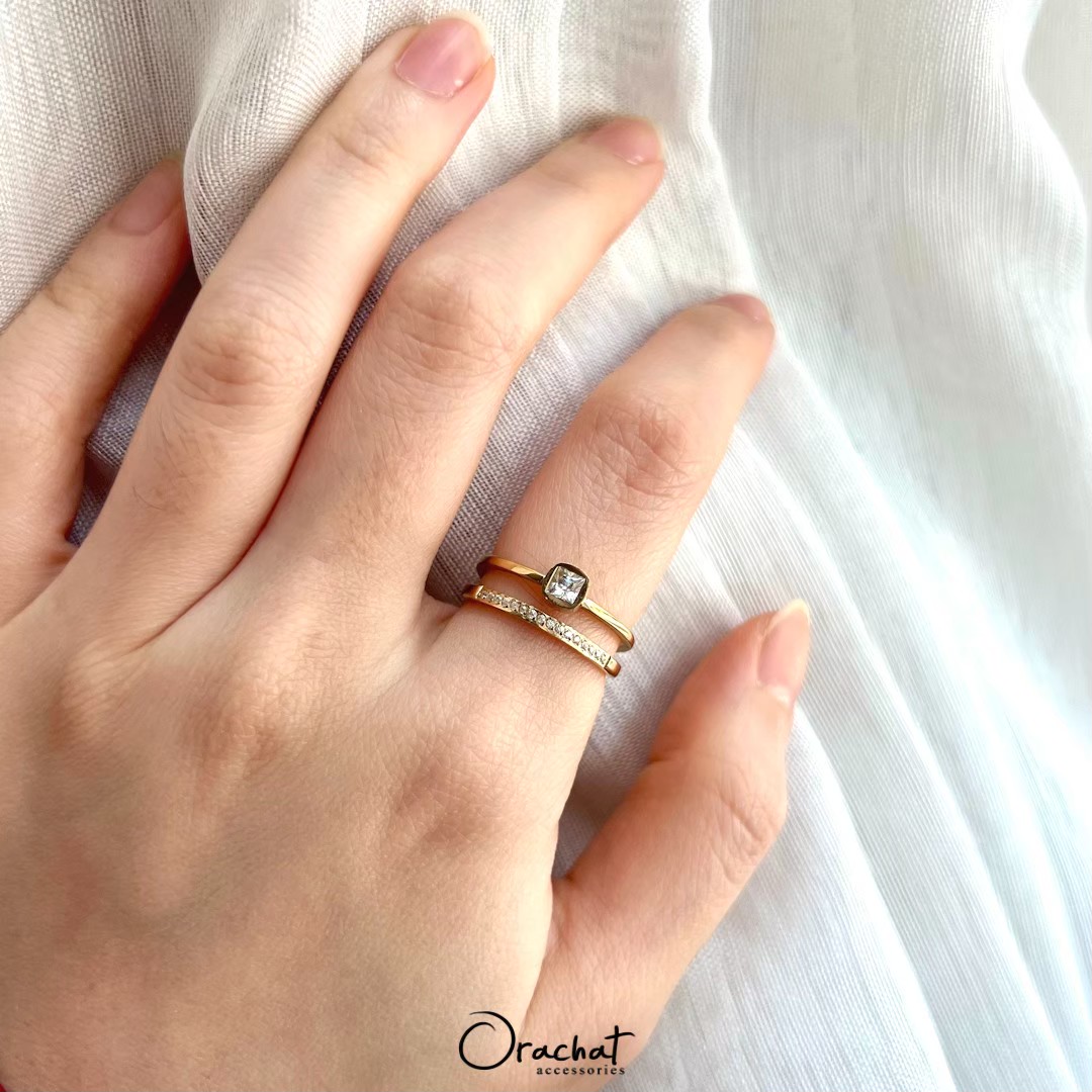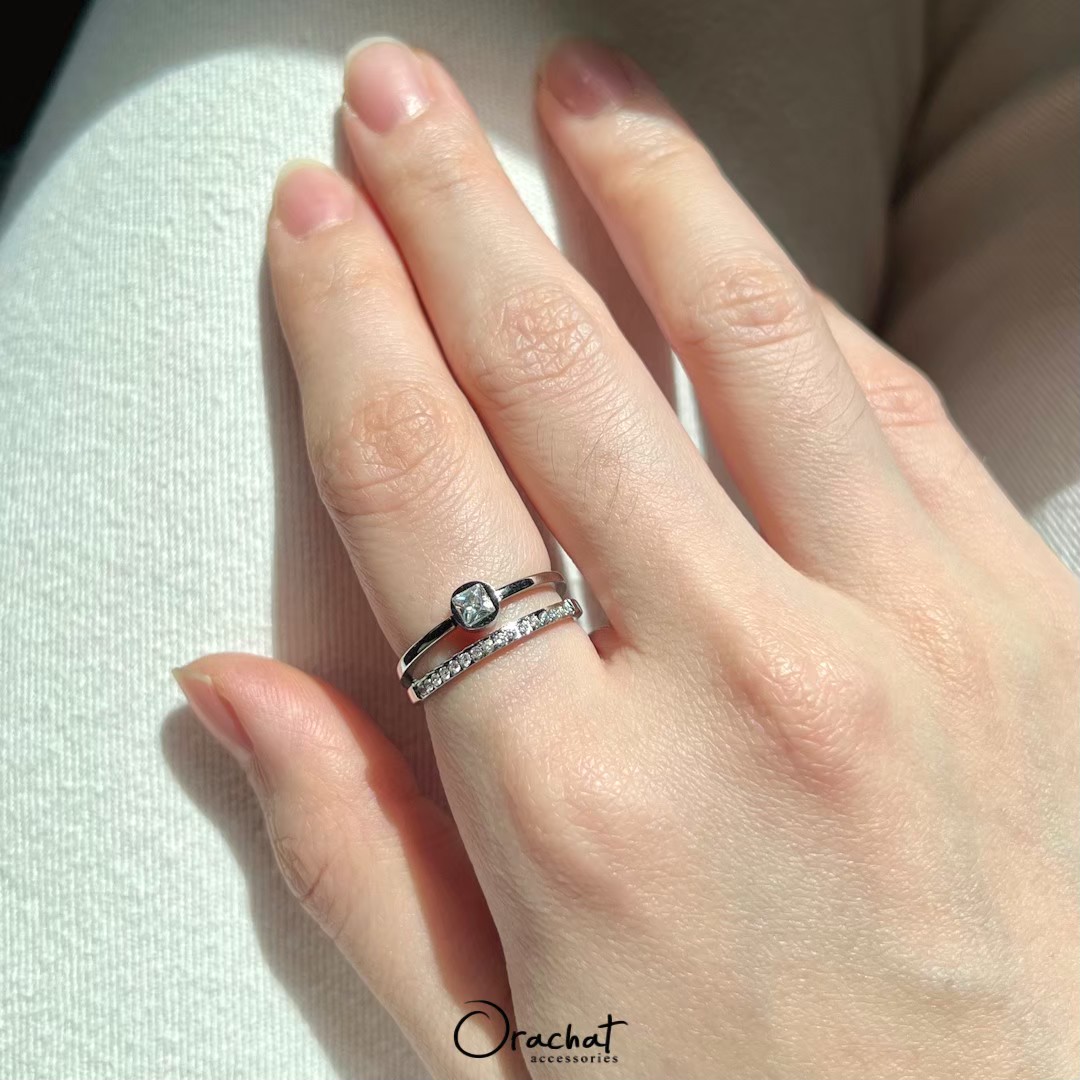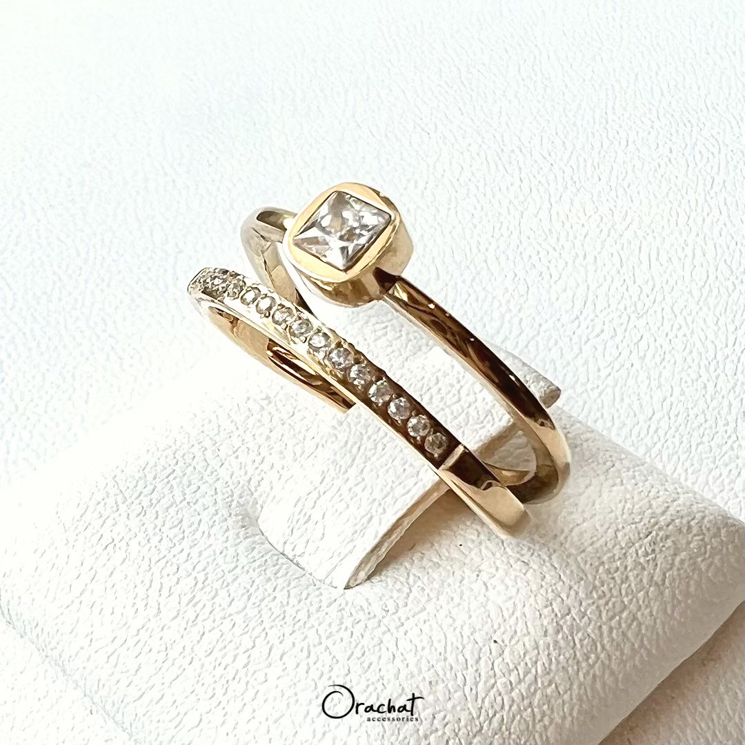 แหวน 2 ชั้น ดีไซน์สุดคลาสสิค สวยเก๋ ดูดี มีรสนิยม คุ้มมาก ซื้อ 1 เหมือนได้ 2 วง! ชั้นนึงเป็นหัวเพชรเรียบ อีกชั้นเป็นเพชรแถวครึ่งวง ใช้เพชร CZ เกรดพรีเมียม สวยวิ้งเล่นไฟมากกกกก งาน jewelry ขึ้นห้างขายหลักพัน ตัวเรือนชุบ 14k (สแตนเลส) ไม่ลอกไม่ดำ สวย ทน เงา โดนน้ำ โดนน้ำหอม ใส่ล้างจาน ใช้เจลแอลกอฮอลล์ได้สบายๆเลยค่ะ
