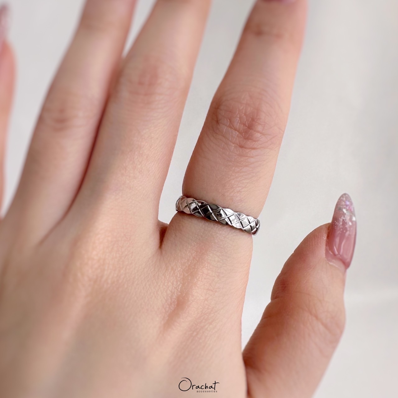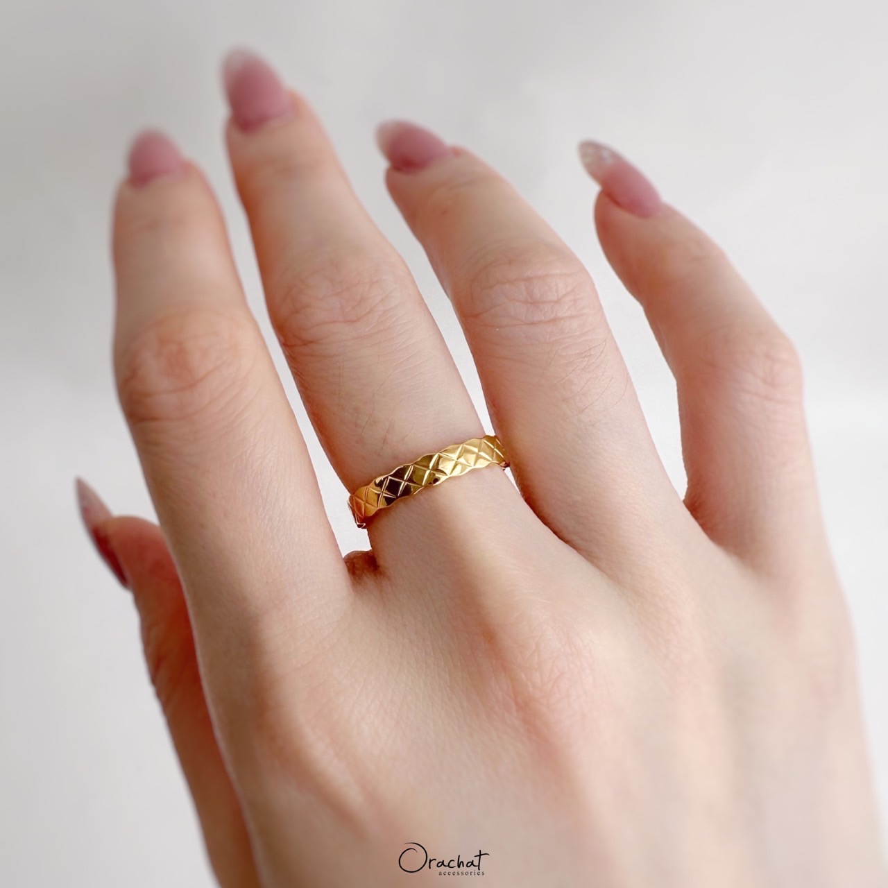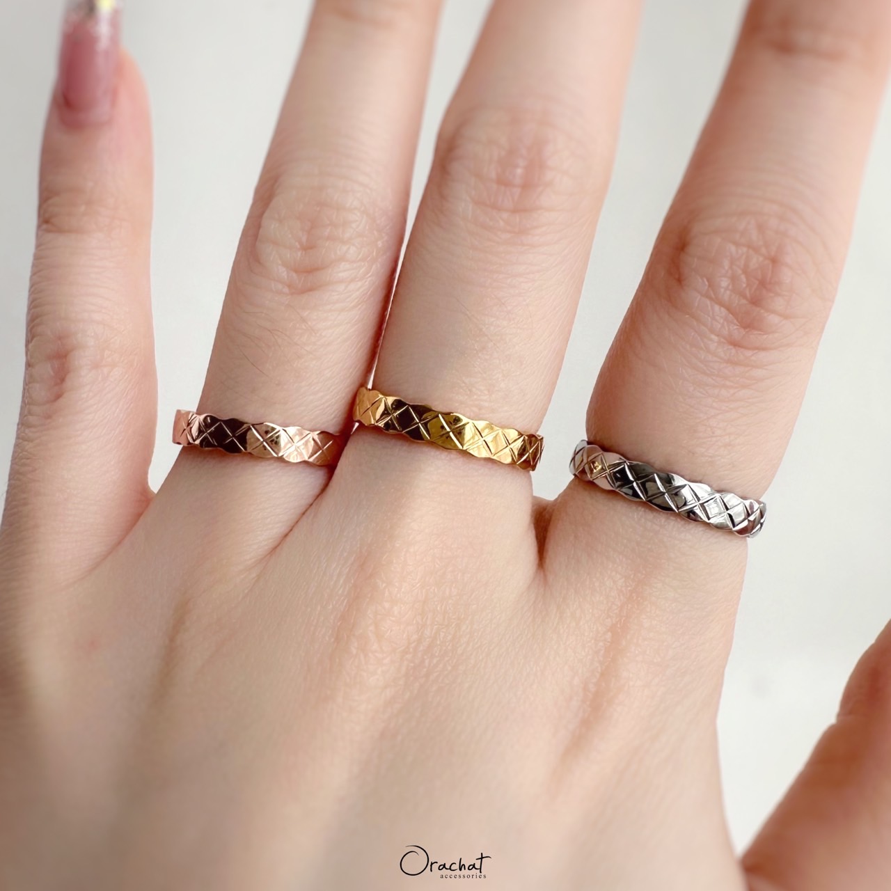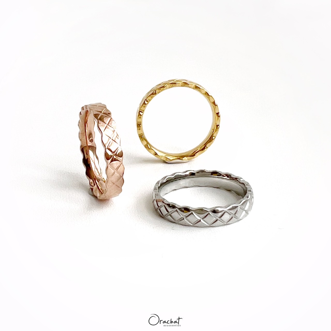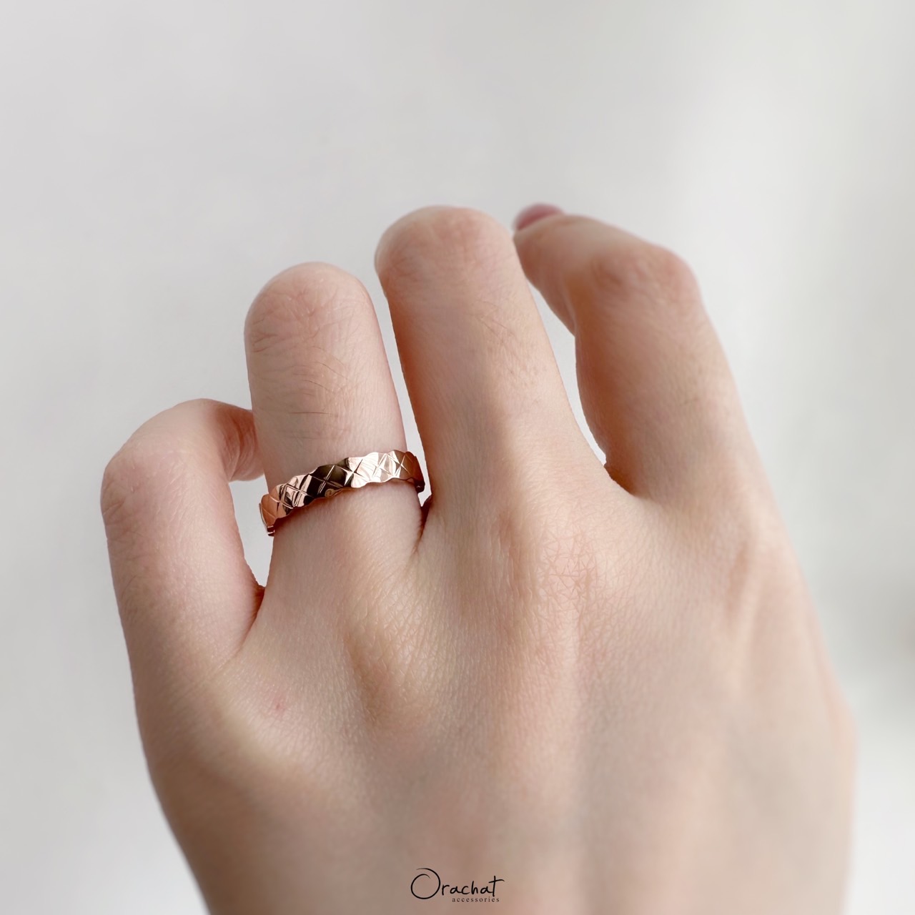 เรียบ หรู ดูดี และมีสไตล์ แหวนเกลี้ยงลายตารางบากฟีลเหมือนลายของกระเป๋าที่เย็บคาดกัน สวยเก๋ทีเทสสุดๆ รุ่นนี้หน้าตาจะคล้ายๆรุ่น Taylor นะคะแต่จะบางกว่า