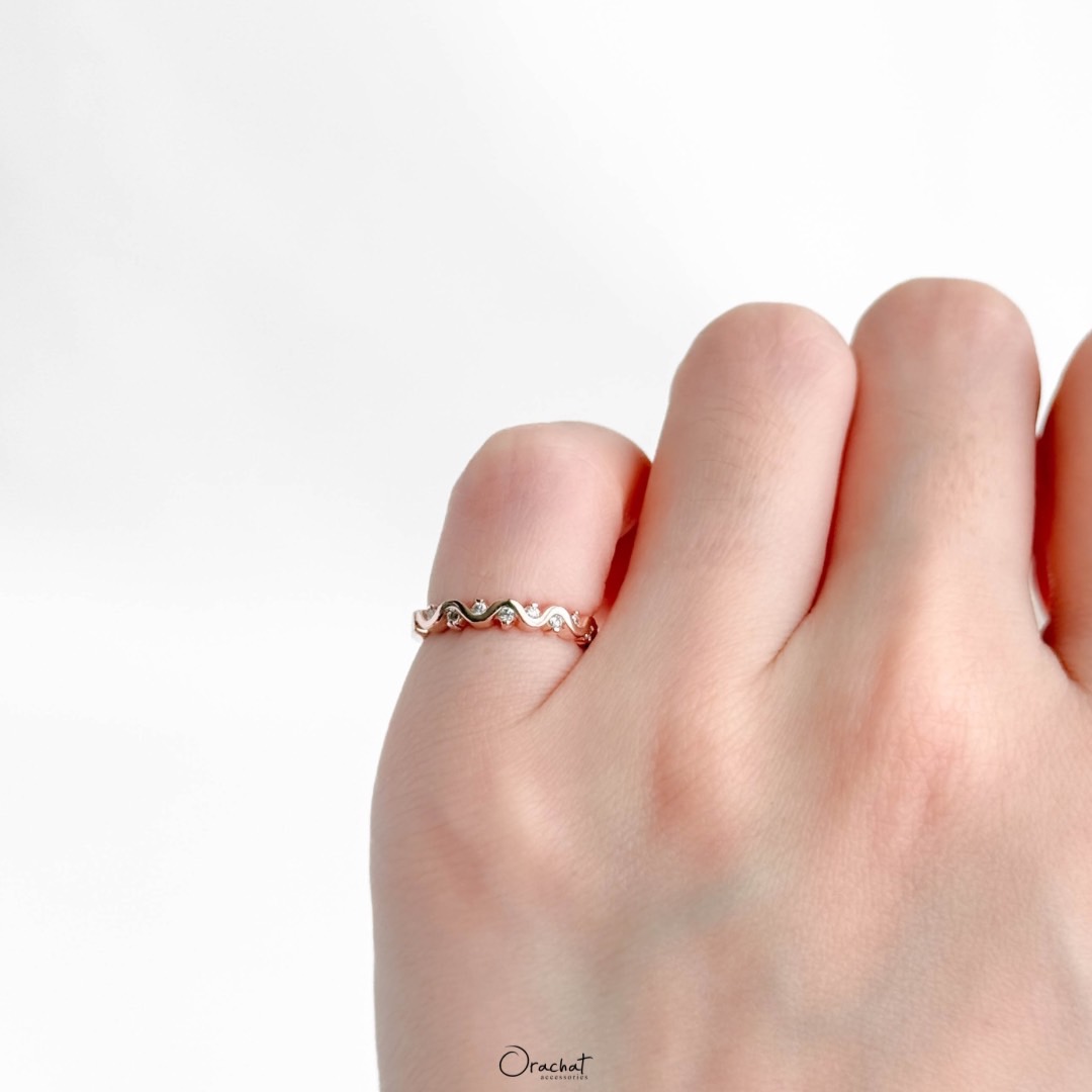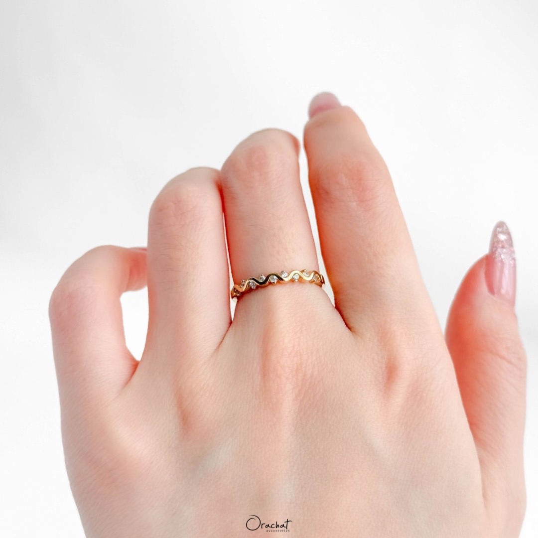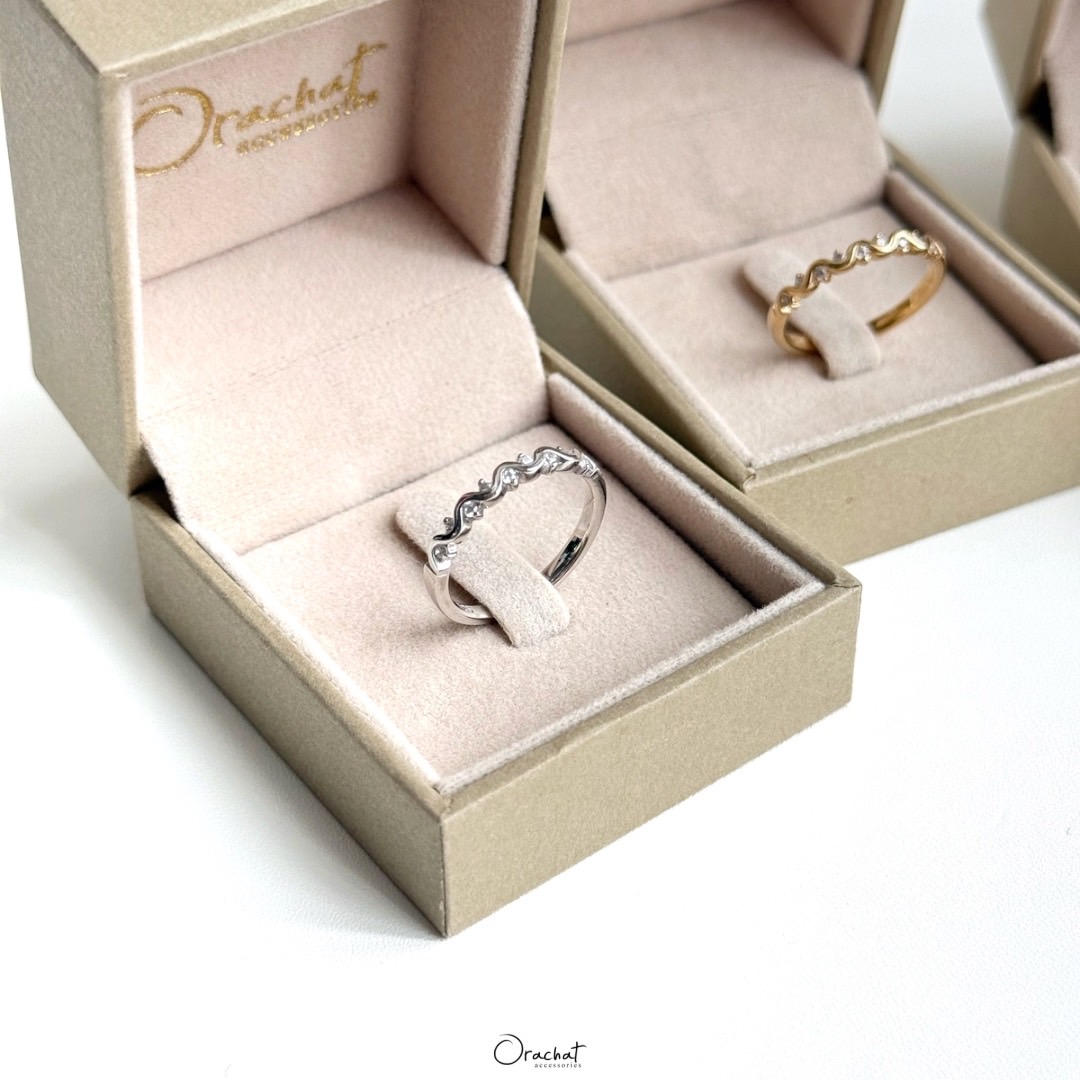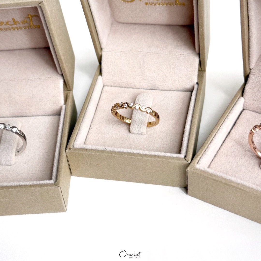 “อ่อนโยน พิถีพิถัน” รุ่นนี้จะเป็นลายคลื่นหยักเล็กๆที่พิถีพิถันมากกก มีกิมมิคคือเพชร CZ ที่แต่งสลับกับลายหยักน้อยๆของแหวน ทำให้ดูมีสไตล์และเพิ่มความหรูหรา
